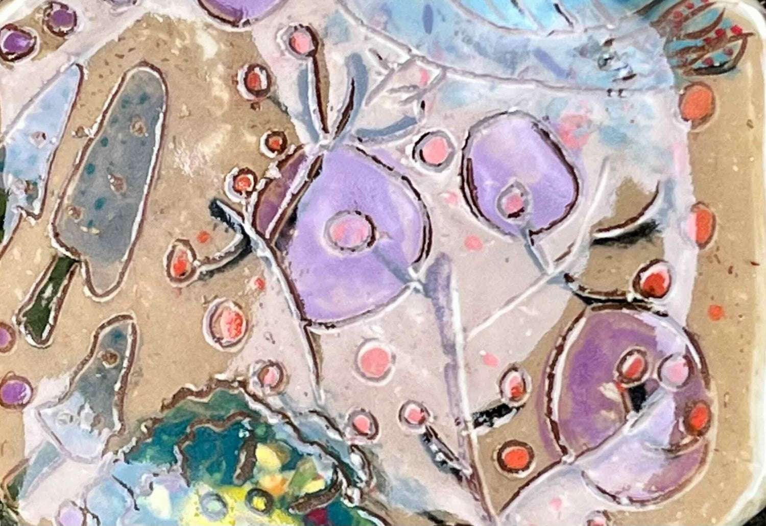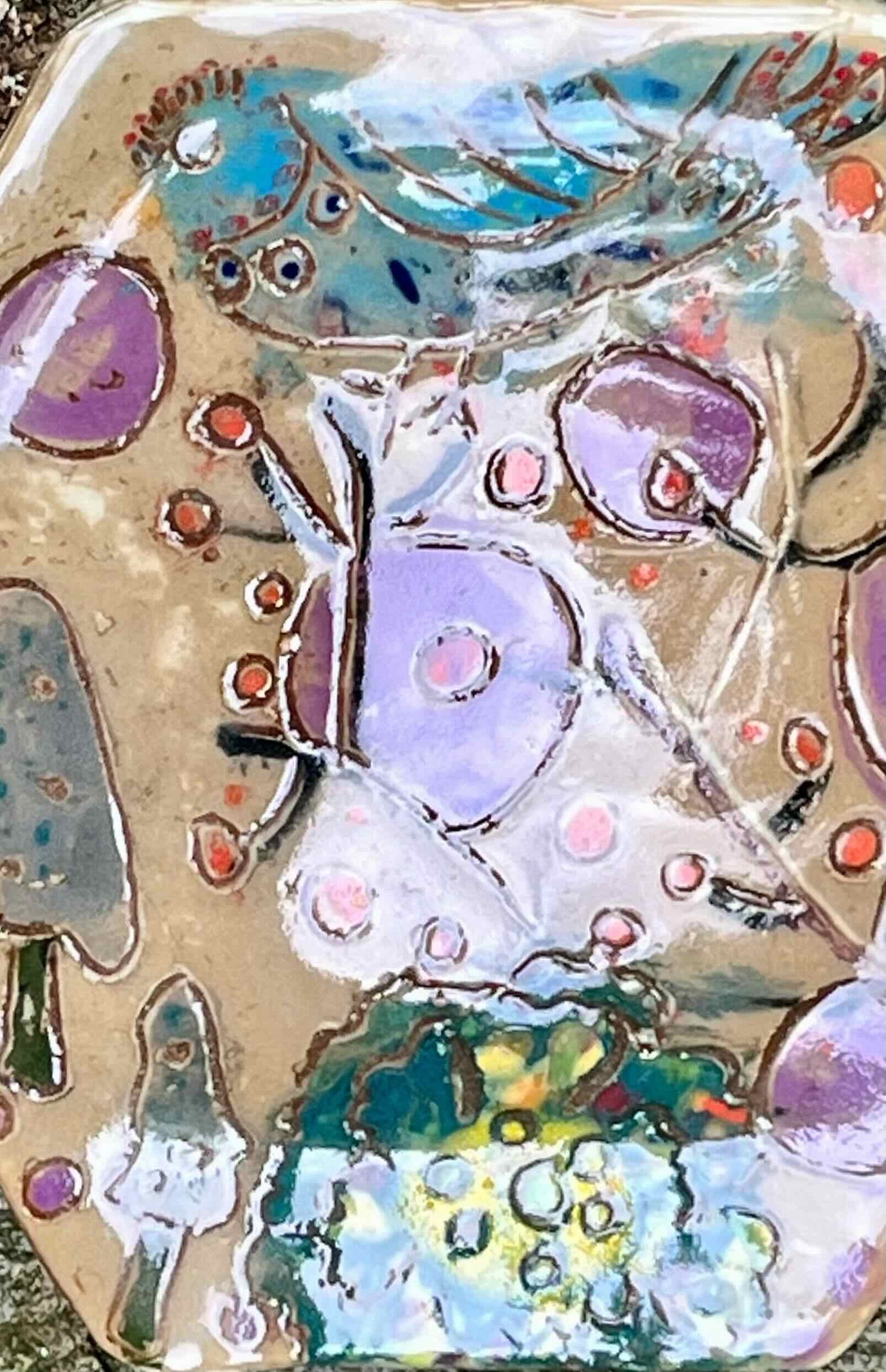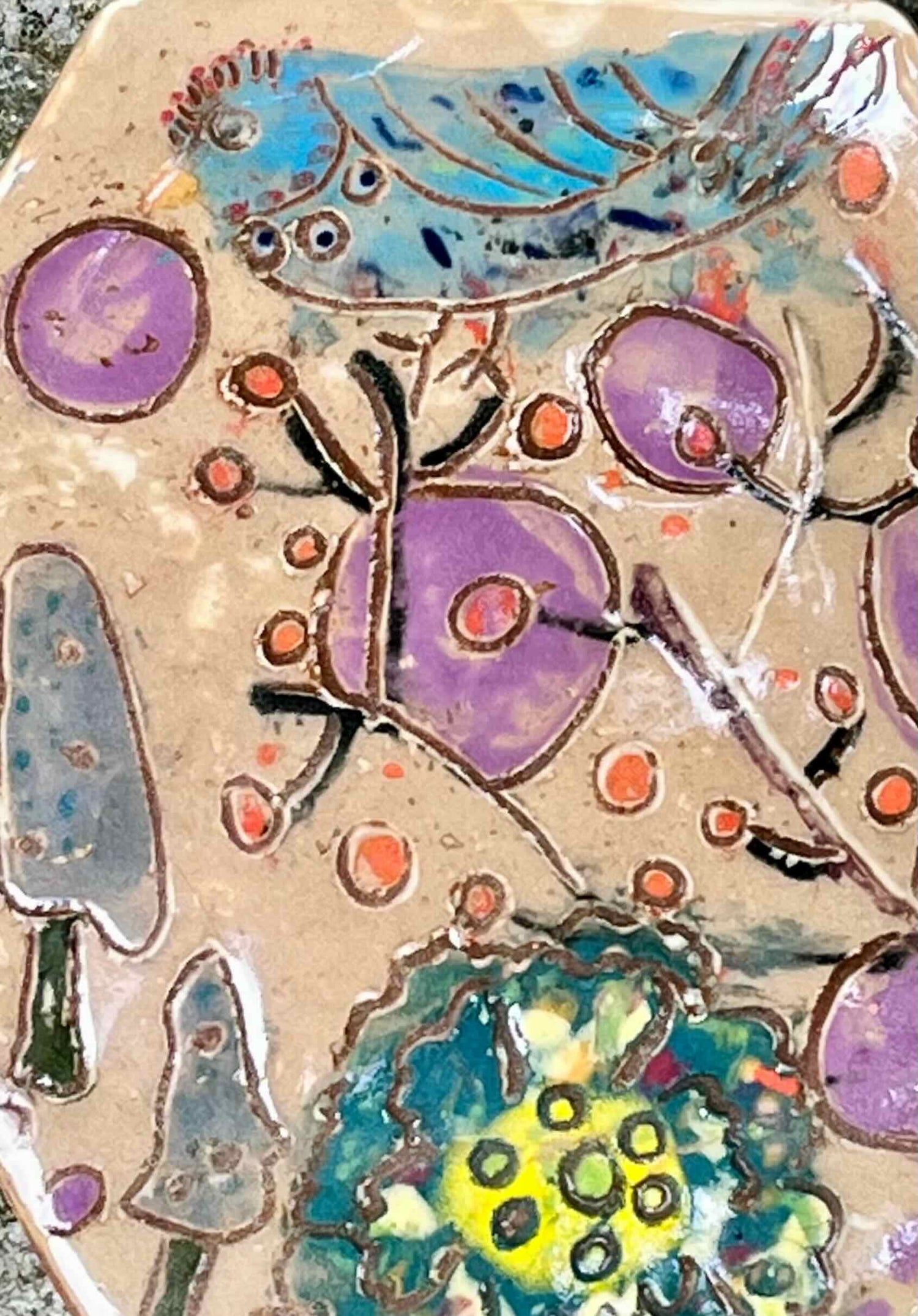 This is a monoprint of a painting I made of a bright blue bird in a sea of flowers. I printed the image onto porcelain clay and then carved the details into the painting. Before the final glaze firing I applied an underglaze wash to emphasize the carving and create an antiqued appearance. a metal hanger has been attached to the back for your convenience.