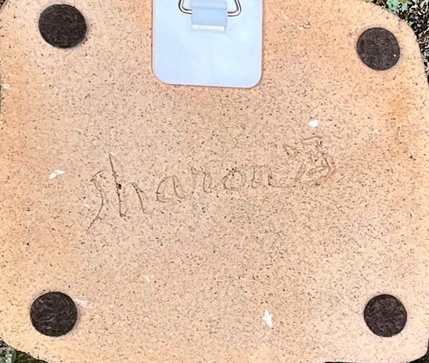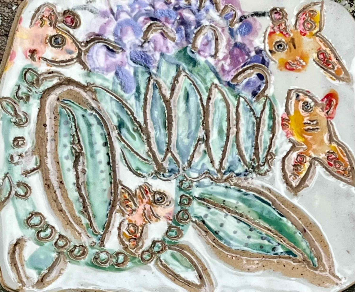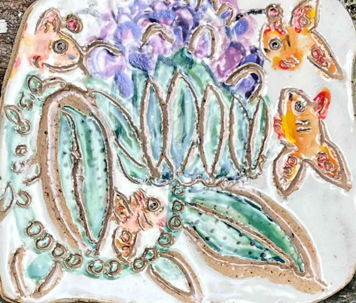 This is a print that I made of a lotus with many happy fish. The painting is first made on newsprint using food-safe underglazes. When that painting dries, I apply a coat of wet slip to the back of the painting and then transfer it onto the clay. I then carve the piece and fire it in the bisque kiln. After this firing, I apply a color wash to the entire piece to both fill in the carved areas and to give the entire piece an antique feeling. This decorative tile has a hook for hanging and four small felt circles placed to protect your wall from scratches.