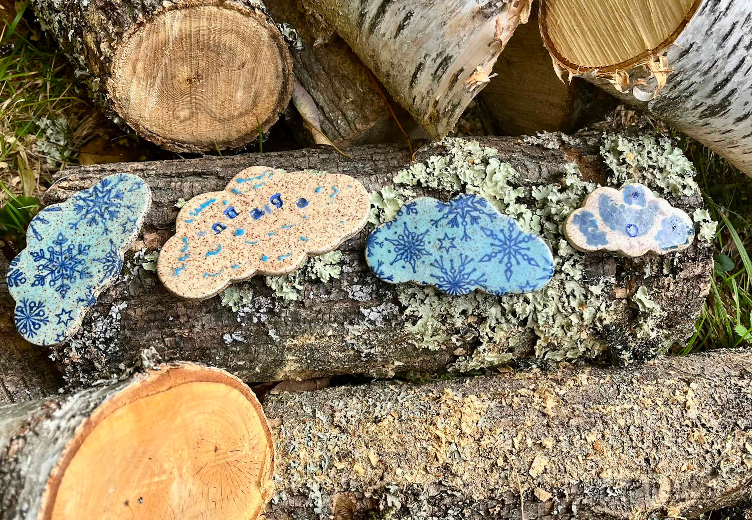 This is a set of four stoneware refrigerator magnets in the shape of clouds. Two clouds have snowflake designs. One cloud has the word for cloud in French language, nuage. One small cloud is hand painted with a blue bird.